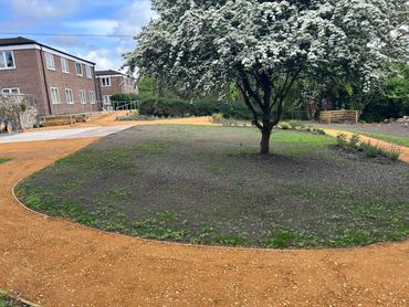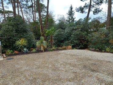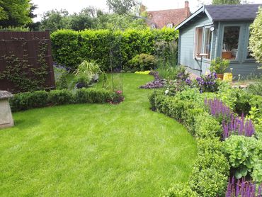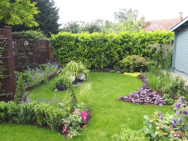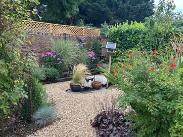 Gravel paving with steel edging and turfed circle, planting to perimeter beds