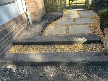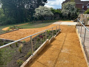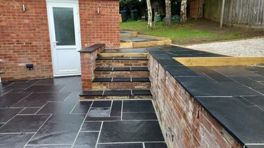 Golden Fossil Sandstone Paving with Red Brick Steps and Kee Klamp Galvanised Handrails to Assist Access