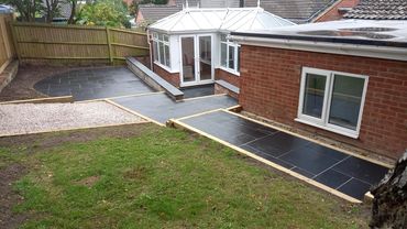 New decking, central sandstone circle and fountain, gravel paving retained with steel edging