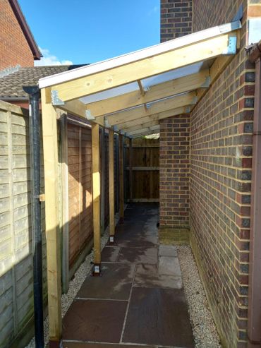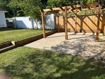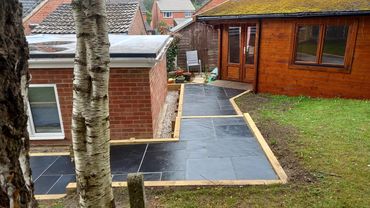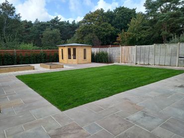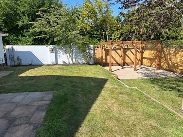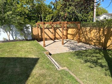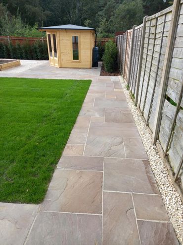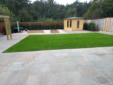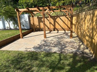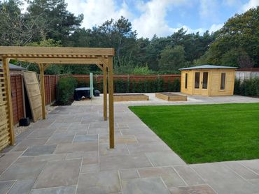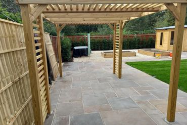 Timber Pergola and Arch on Raj sandstone random paving with brick edging