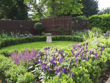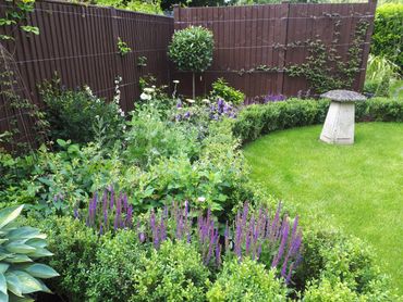 Water feature, arch and mixed planting of shrubs, perennials and grasses